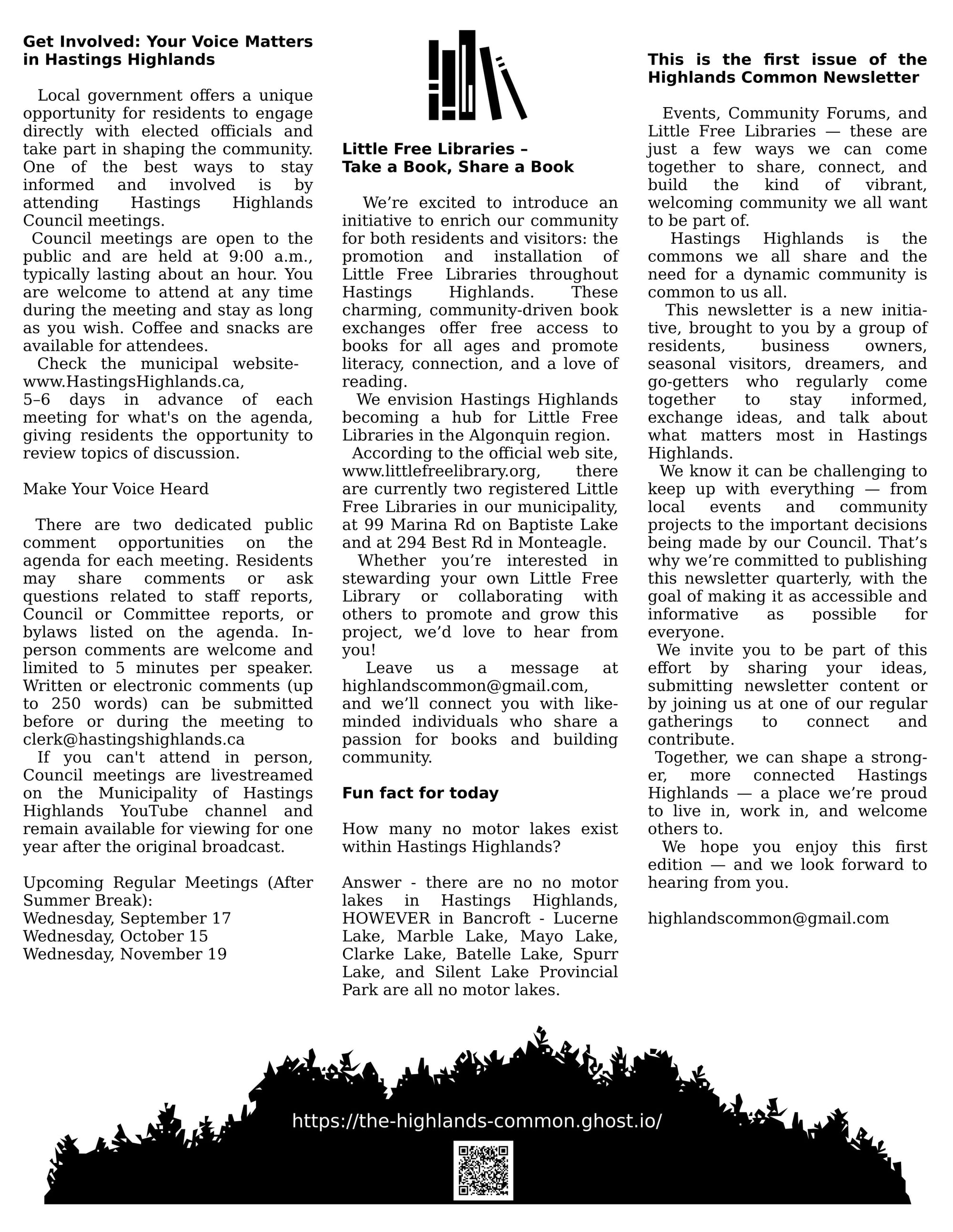 Events, Community Forums, and Little Free Libraries — these are just a few ways we can come together to share, connect, and build the kind of vibrant, welcoming community we all want to be part of.Hastings Highlands is the commons we all share and the need for a dynamic community